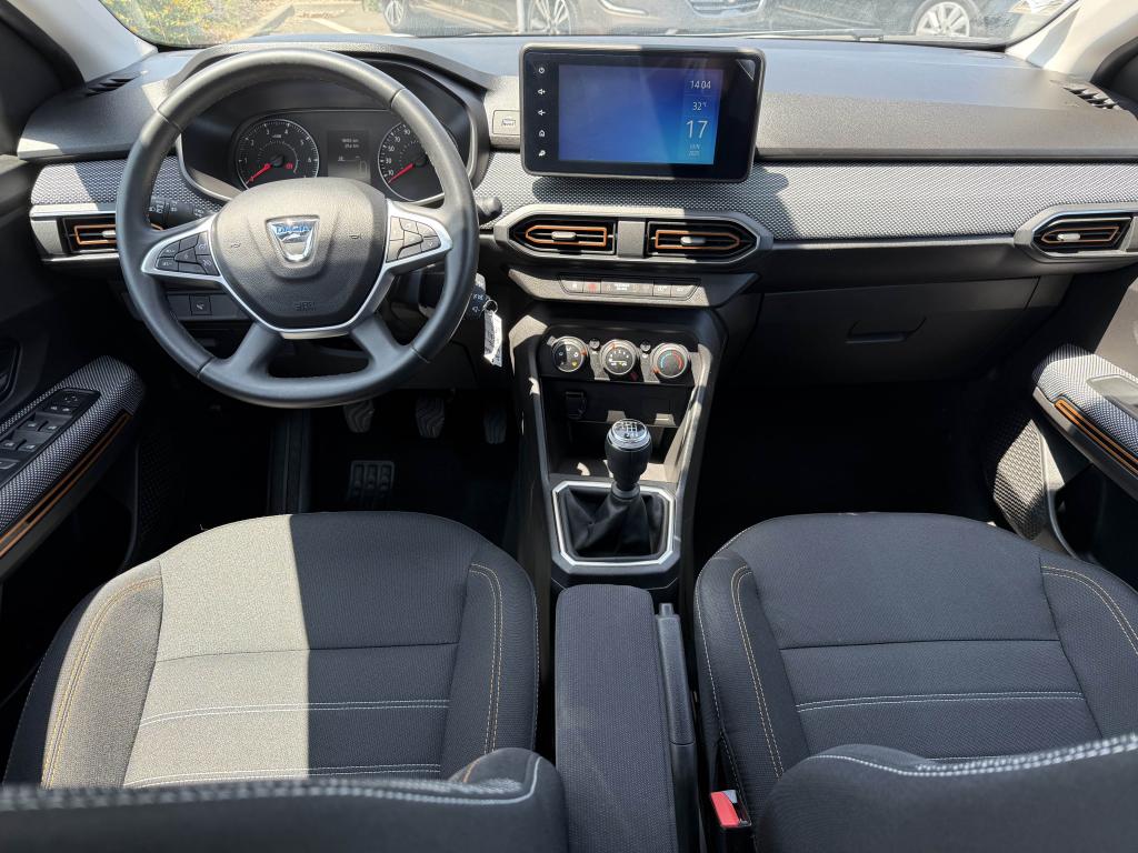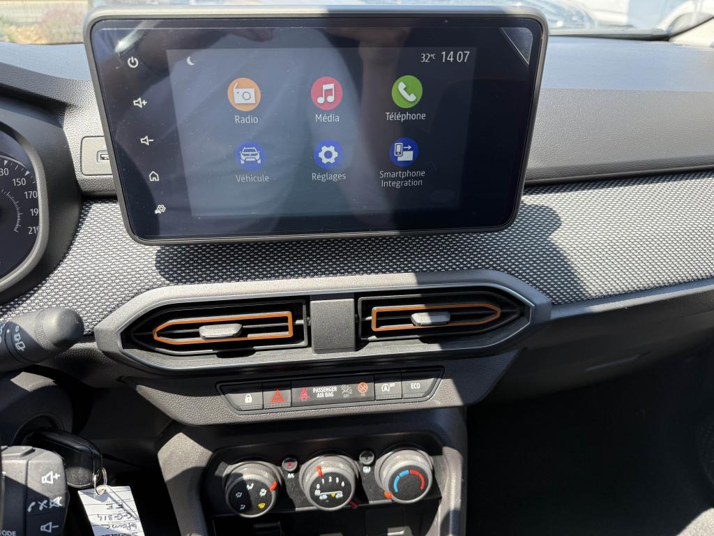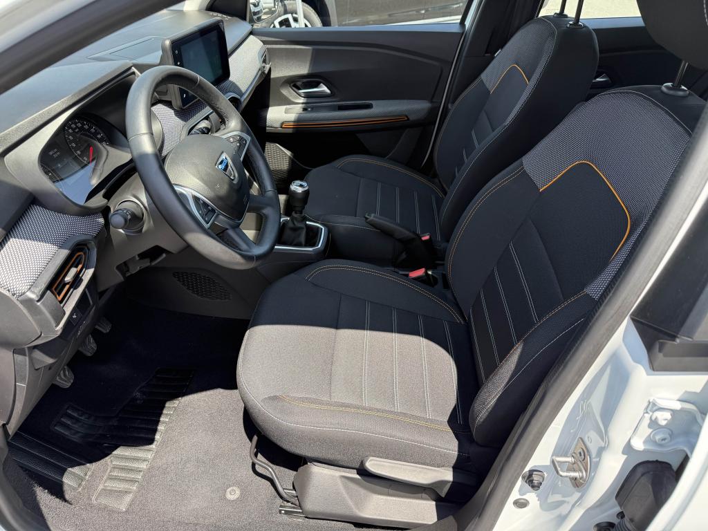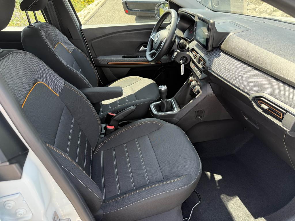 ABS avec aide au freinage d'urgenceAccoudoir central avantAide au démarrage en côteAide au stationnement arrièreAirbags conducteur et passagerAirbags latéraux thorax + rideaux avant et arrièreAppel d'urgence - EcallBanquette arrière rabattable et fractionnable 1/3-2/3Barres de toit longitudinales modulaires (gris quartz)Boucliers avant et arrière ton carrosserieBoutons de commandes volant pour ordinateur de bordCalandre avec inscription "Stepway" chroméeCalandre chroméeClimatisation manuelleCondamnation automatique des portes en roulantCondamnation des portes électrique avec télécommande à radiofréquencesContours des aérateurs chrome satin et orange cuivreContrôle de pression des pneus ( TPMS )Direction assistée électriqueEclairage du coffreEnjoliveur Orange sur les accoudoirs des portes avantEnjoliveurs Flexwheel 16” Saria - gris foncé avec logo Dacia chroméEPS : Contröle électronique de stabilitéEssuie-glace à déclenchement automatiqueFeux de brouillard avant avec enjoliveur chroméFeux de jour automatiques à LEDFreinage actif d’urgence (AEBS Interurbain)Kit de gonflageLève-vitres arrière électriquesLève-vitres impulsionnel anti-pincement conducteur et électrique passager avantLimiteur de vitesse avec avertisseur sonoreMedia Display 8” : Radio DAB + smartphone replication via câble USB, connexion Bluetooth, 4 haut-parleurs, écran tactile 8” + support téléphone amovibleMiroir de courtoisie côté conducteur et passagerOrdinateur de bord : distance parcourue, vitesse moyenne, autonomie, consommation moyennePlancher de coffre modulable à deux niveauxPoignées de maintien avant (côté passager) et arrièrePoignées de porte extérieures ton carrosserie de type réfrigérateurPoignées de portes intérieures finition chrome satinéPommeau de levier de vitesse avec insert chroméPrise 12V à l'avantPrise USB avantProgramme Eco-modeProjecteurs antibrouillardProtection de passages de roue et bas de marche noirsRégulateur de vitesseRétroviseurs extérieurs couleur carrosserieRétroviseurs extérieurs réglables électriquementRevêtement tissu sur la planche de bord et accoudoirs portes avantSellerie Stepway à insertions et surpiqures orangeSiège conducteur réglable en hauteurSignature lumineuse à LEDSkis avant/arrière chromésSystème de contrôle de trajectoire (ESC) avec fonction antipatinage (ASR)Système de fixation Isofix pour siège enfant aux places latérales arrièreSystème Stop & StartVitres teintéesVolant réglable en hauteurVolant réglable en profondeurVolant Softfeel