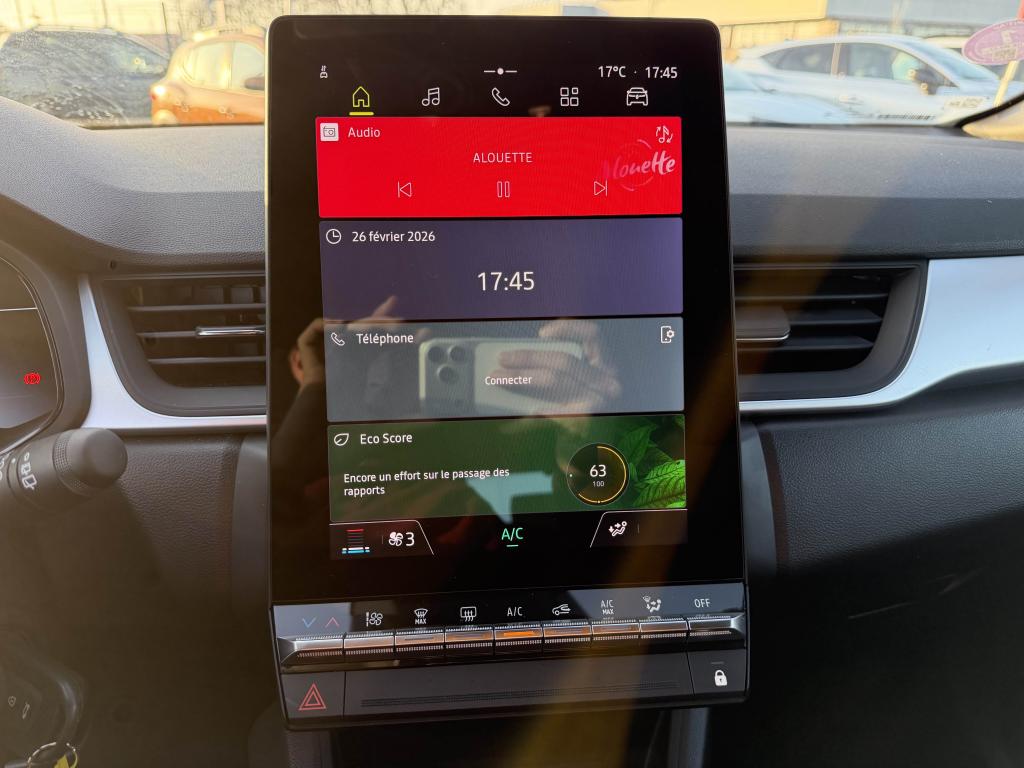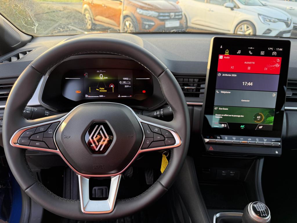 1 prise jack aux places avant2 Prises USB C à l'avantAccoudoir / console centrale avec rangementAide au démarrage en côteAide au stationnement arrièreAirbags frontaux et latéraux (tête thorax),conducteur et passagerAirbags rideaux avant et arrièreAlerte de franchissement de ligneAlerte de survitesse avec reconnaissance des panneaux de signalisationAlerte distance de sécuritéAlerte oubli des ceintures de sécurité aux 5 places avec détection des occupantsAllumage automatique des projecteursAntenne de type requin couleur noir brillantAppel d'Urgence RenaultAssistance au maintien de voieBandeau supérieur de décor gris métalliqueBanquette arrière coulissante, rabattable 1/3-2/3 avec 3 appuis-têtes réglables en hauteurBluetoothCalandre avec graphisme 3D : partie supérieure noire avec graphisme ton caisse - partie inférieure ton caisseCaméra de reculCarte Renault mains-libresClimatisation manuelleCoiffe supérieure de planche de bord gainéeCondamnation électrique centralisée des portes avec télécommande et condamnation des portes en roulantDécors chrome satiné sur volantDéflecteurs d’air noir brillantDésactivation manuelle de l'airbag passagerDétecteur de fatigueDétection arrière avec correction trajectoire d’urgenceDétection avant avec correction trajectoire d’urgenceEclairage intelligent (commutation automatique feux de croisement/feux de route)Enjoliveurs 17'' NympheaEntourage de levier de vitesse en chrome satinéESC (contrôle électronique de la trajectoire)Feux de stop à LEDFreinage automatique d’urgence aux intersectionsFreinage automatique d’urgence urbain, inter-urbain (avec détection voitures, piétons, cyclistes)Lève vitres électriques avant et arrière impulsionnelsMise à jour système inclus pendant 5 ansMode EcoMontants de portes noirsMy safety switchNotice d’utilisation digitale embarquée dans le système multimédia du véhiculeOpenR link 10,4” : système multimédia avec radio intégréePack remote services (via l'application My Renault) inclus pendant 5 ansPlage arrièrePoignées de portes extérieures ton caissePoignées de portes intérieures finition chrome satinéPommeau de levier de vitesse en textile refinedProjecteurs avant Performance 100 % LED : Renault LED pure visionProtections inférieures de porte noir grainéRégulateur et limiteur de vitesseRéplication smartphone compatible Android Auto & Apple CarPlayRétroviseurs extérieurs noirs brillantsRétroviseurs extérieurs réglables, rabattables électriquement et dégivrantsSellerie tissuSiège conducteur réglable en hauteurSkis avant et arrière noirSystème antiblocage des roues (ABS)Système audio Arkamys auditorium avec 6 haut-parleursSystème de détection de la pression des pneusSystème de fixation ISOFIX aux places latérales arrière et passager avantTableau de bord avec écran numérique et personnalisable 7”Volant en textile refinedVolant réglable en hauteur et en profondeur